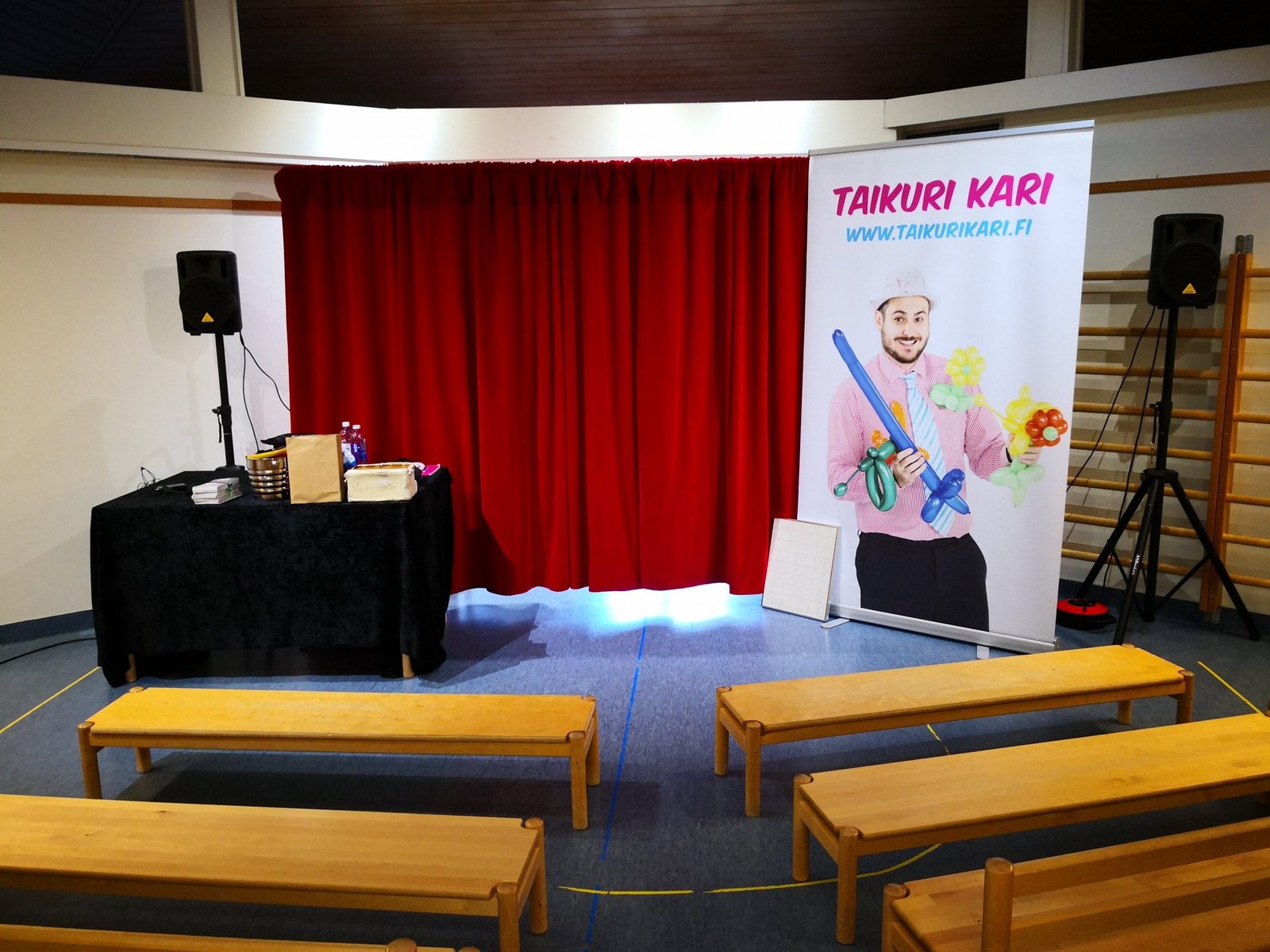 Kari tuo mukanaan äänentoiston, taustaverhon ja kaikki tarvittavat välineet.